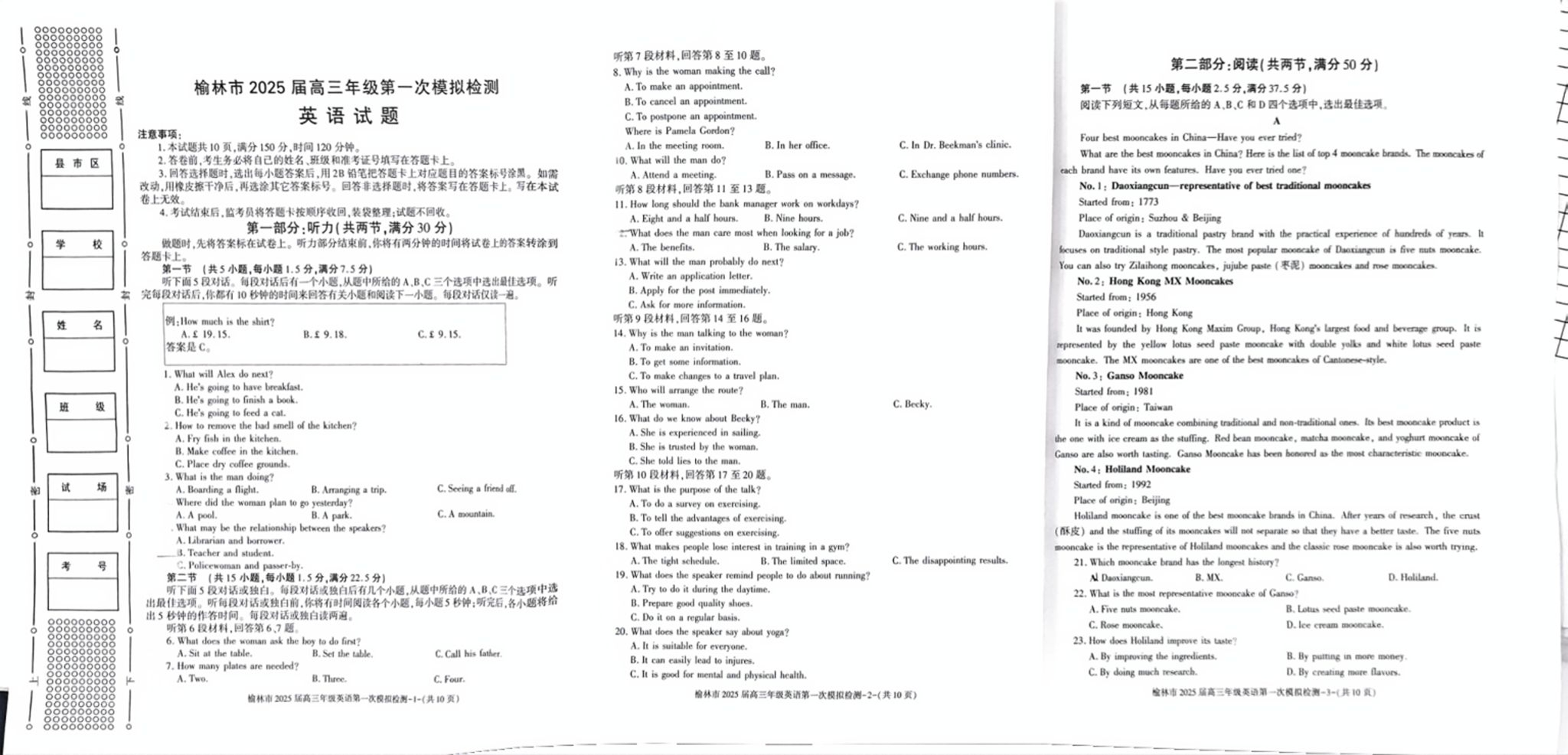 陕西省榆林市2025届高三年级第一次模拟检测 英语