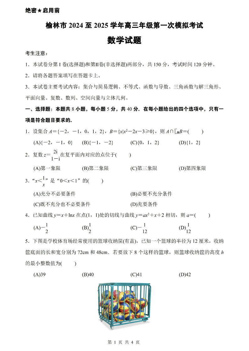 陕西省榆林市2025届高三年级第一次模拟检测 数学