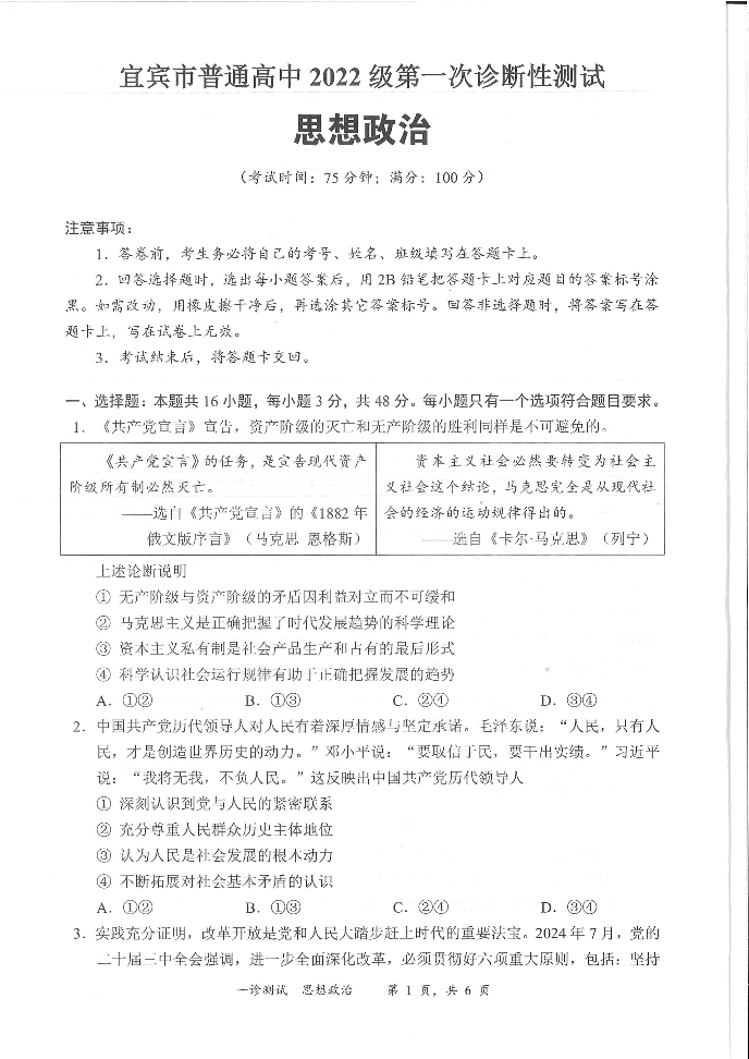 四川省宜宾市2025届高三第一次诊断性考试 政治