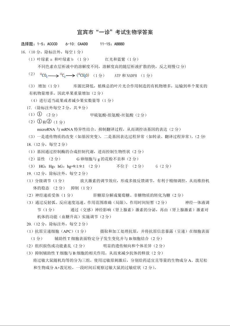 四川省宜宾市2025届高三第一次诊断性考试 生物答案