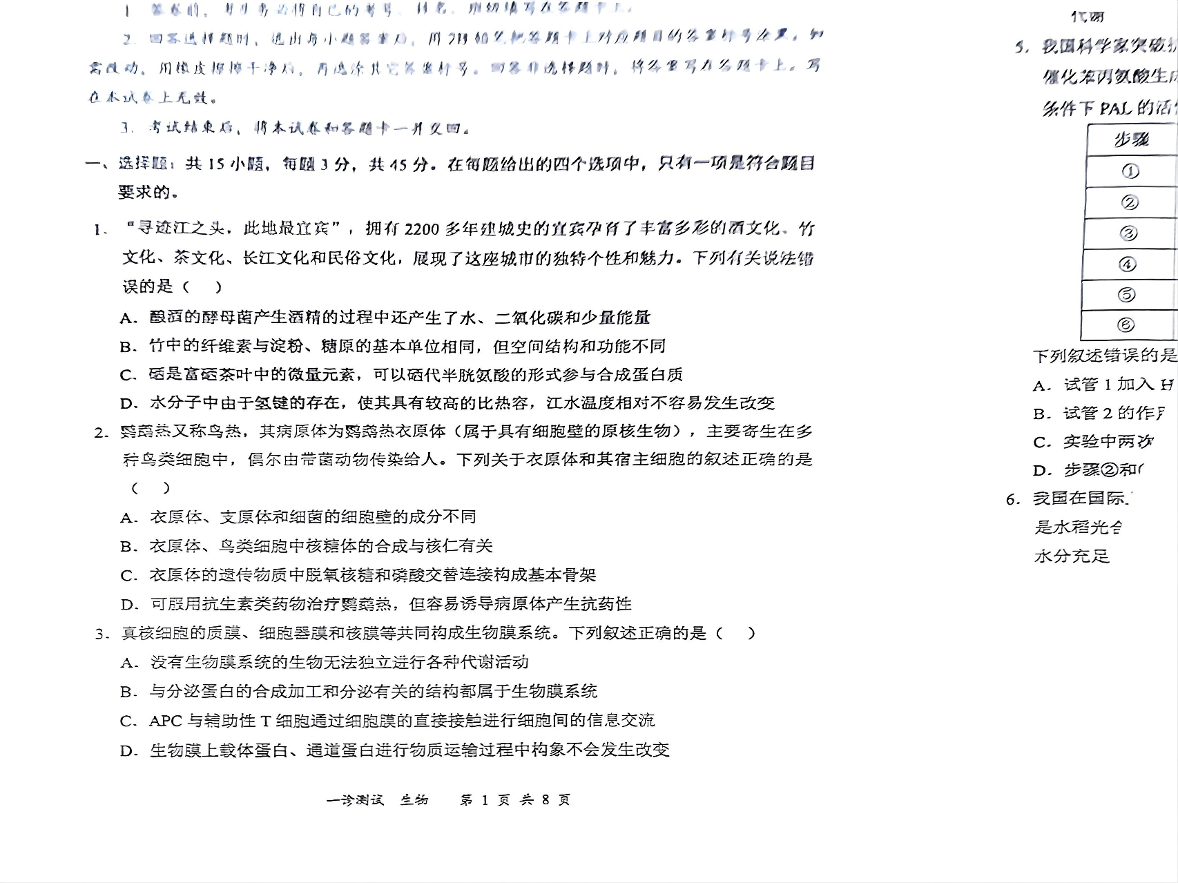 四川省宜宾市2025届高三第一次诊断性考试 生物