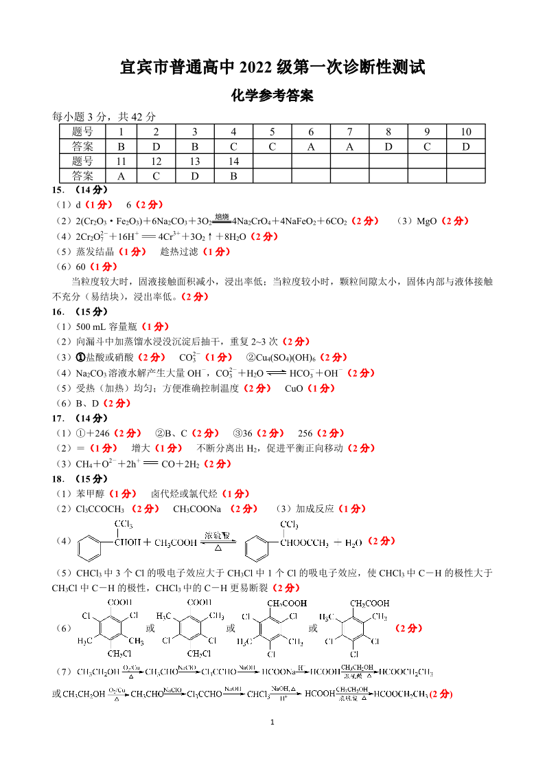 四川省宜宾市2025届高三第一次诊断性考试 化学答案