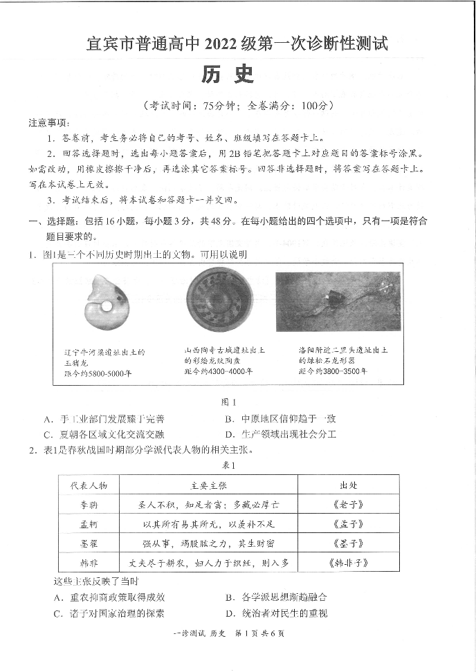 四川省宜宾市2025届高三第一次诊断性考试 历史