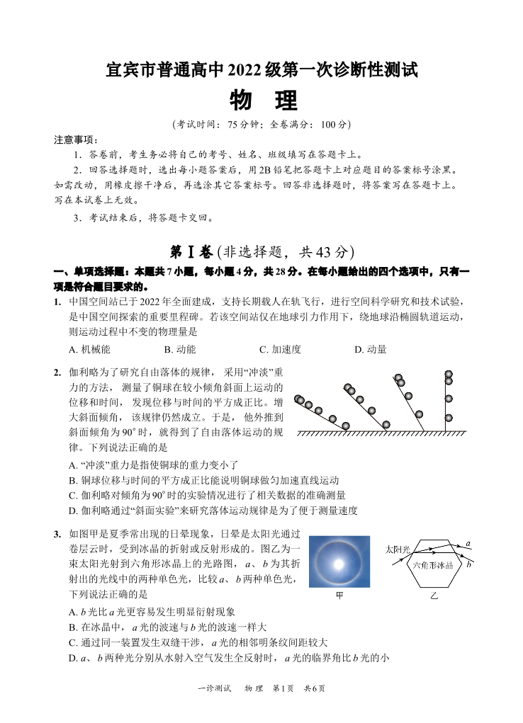四川省宜宾市2025届高三第一次诊断性考试 物理
