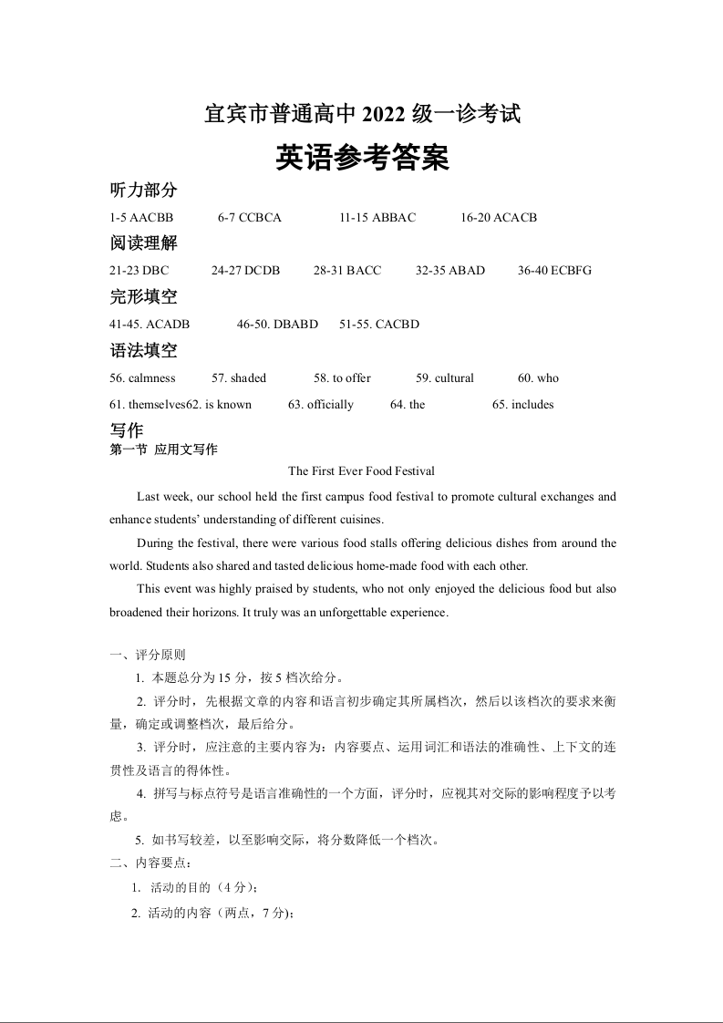 四川省宜宾市2025届高三第一次诊断性考试 英语答案
