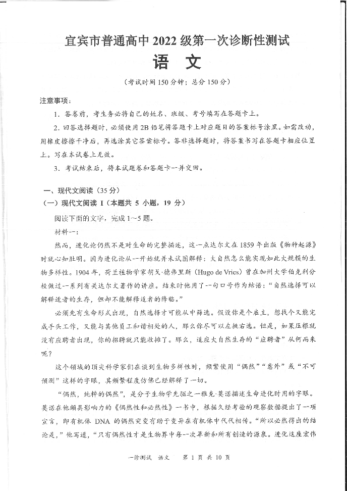 四川省宜宾市2025届高三第一次诊断性考试 语文