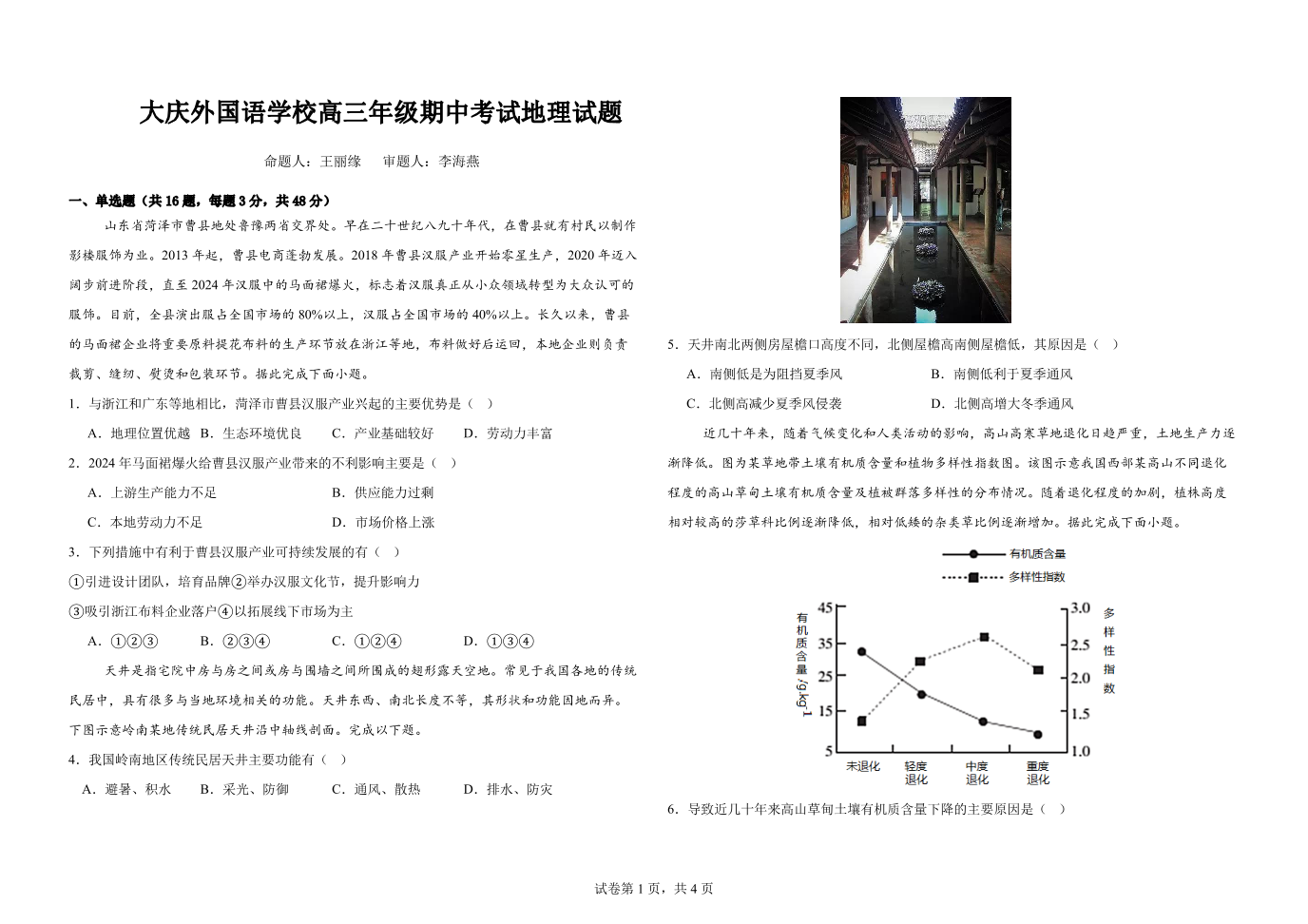 黑龙江省大庆外国语学校2024-2025学年高三上学期期中考试 地理