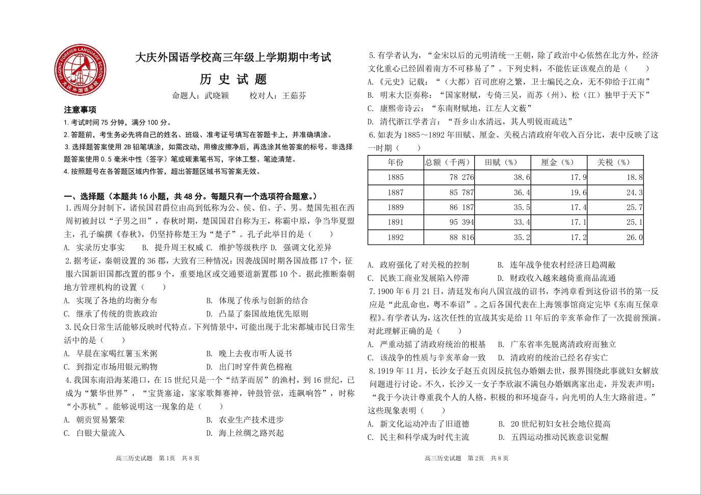 黑龙江省大庆外国语学校2024-2025学年高三上学期期中考试 历史