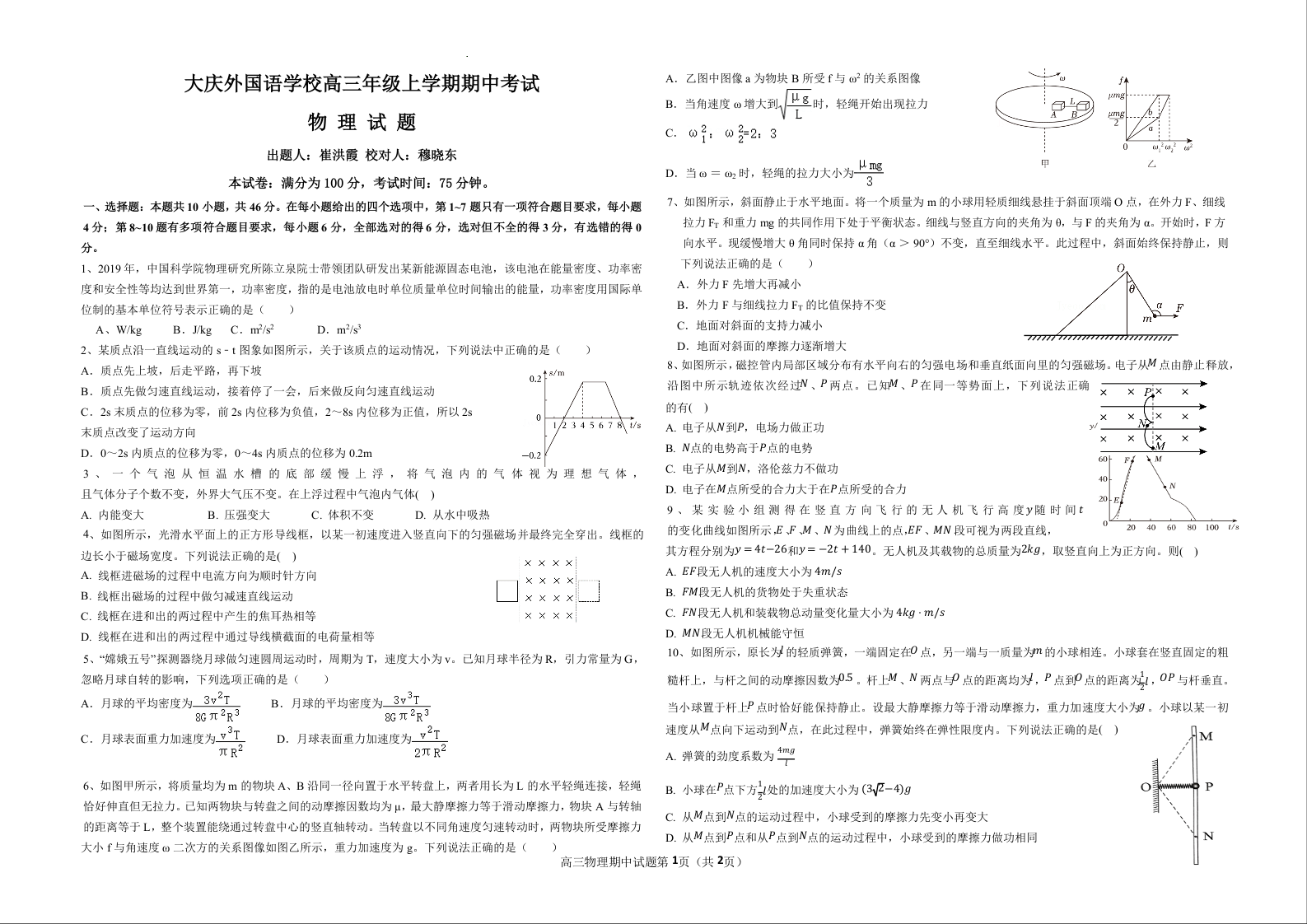 黑龙江省大庆外国语学校2024-2025学年高三上学期期中考试 物理