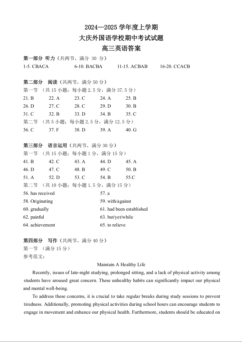 黑龙江省大庆外国语学校2024-2025学年高三上学期期中考试 英语答案