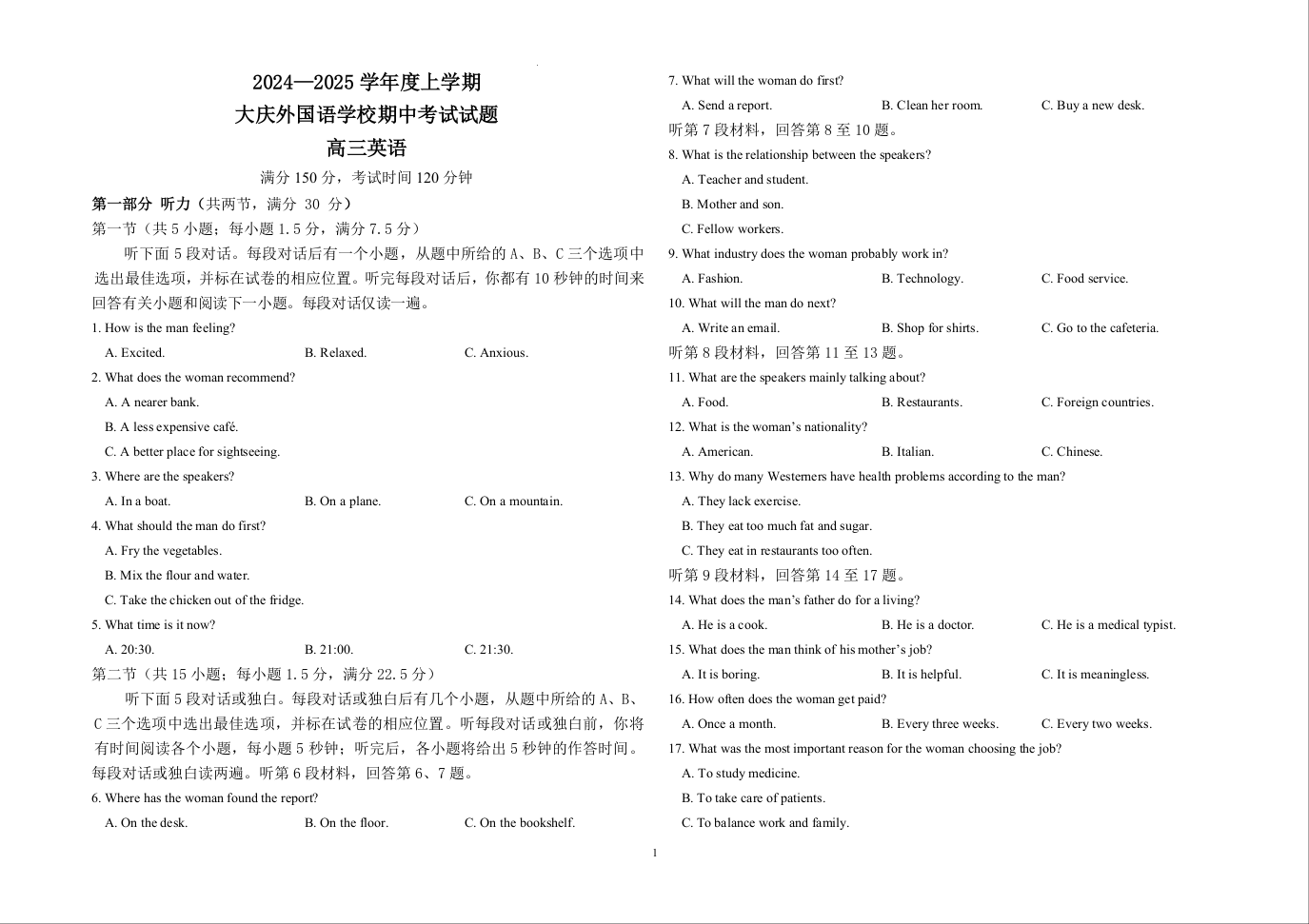 黑龙江省大庆外国语学校2024-2025学年高三上学期期中考试 英语