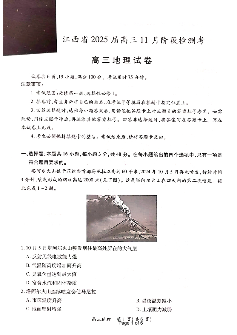 江西省稳派上进联考2025届高三11月阶段检测考 地理