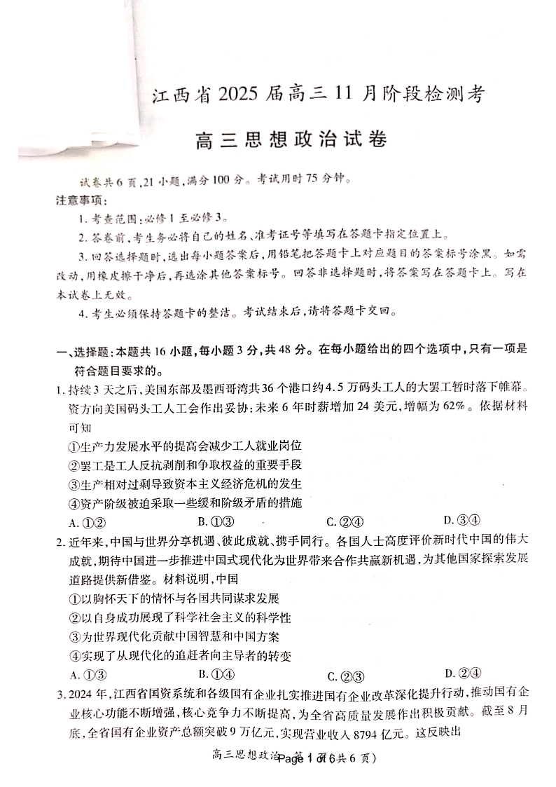 江西省稳派上进联考2025届高三11月阶段检测考 政治
