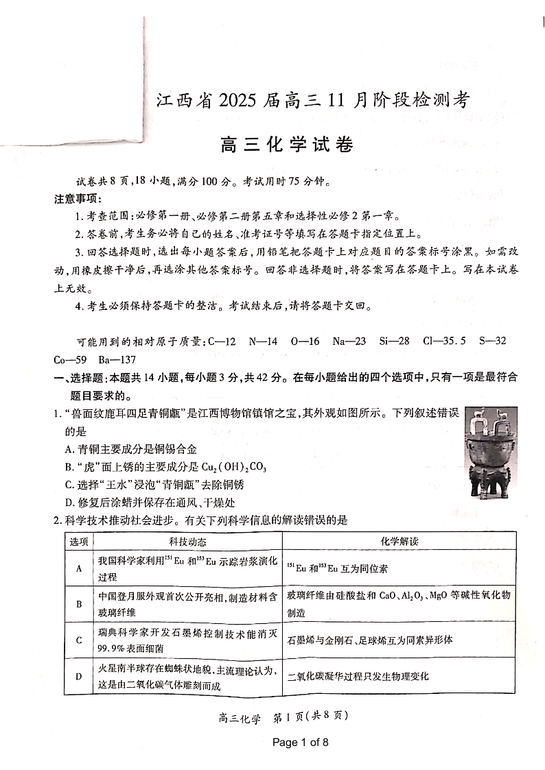 江西省稳派上进联考2025届高三11月阶段检测考 化学