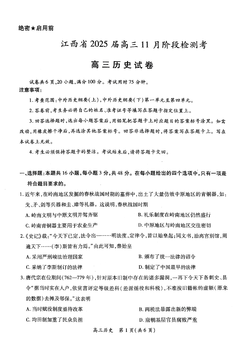 江西省稳派上进联考2025届高三11月阶段检测考 历史