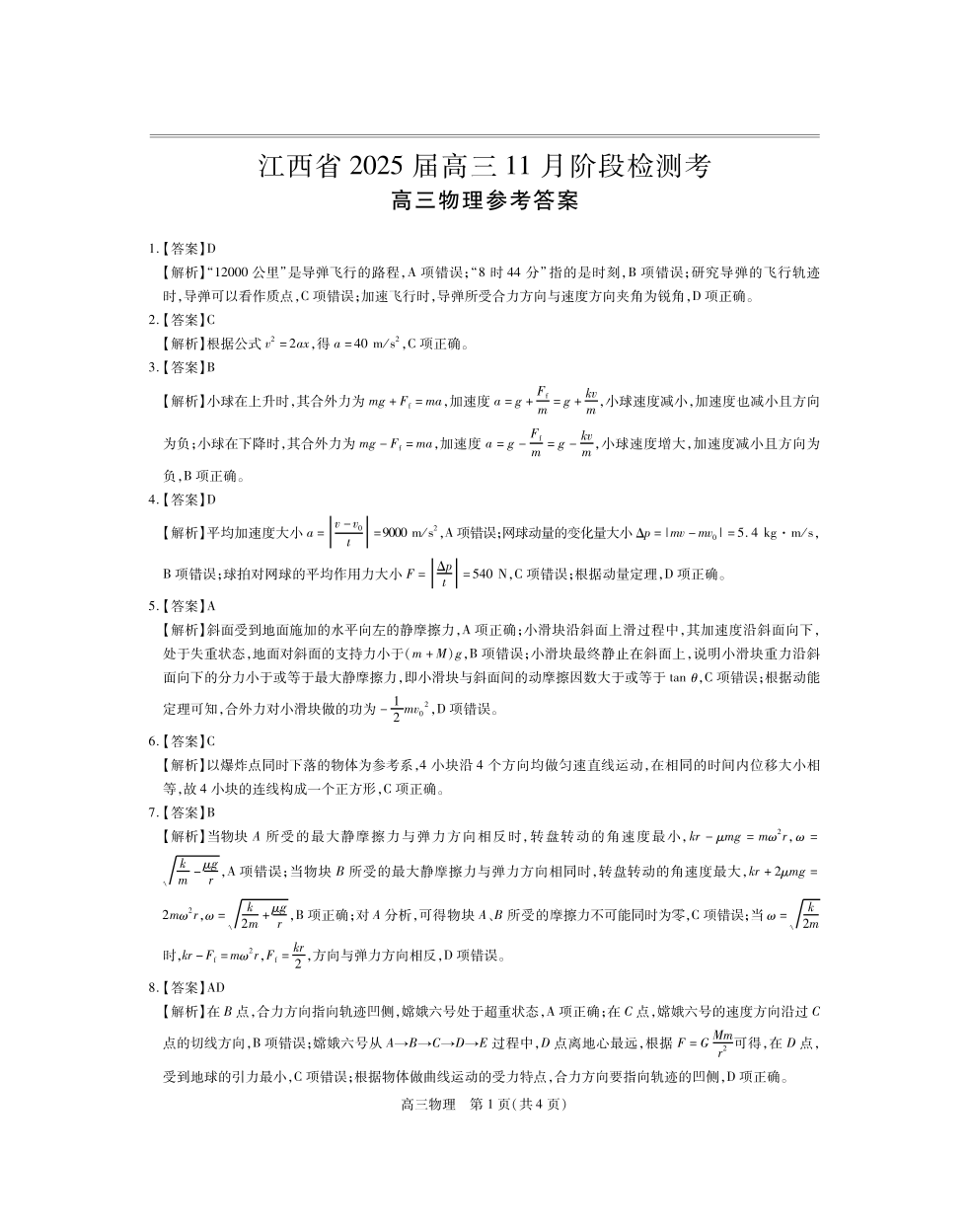 江西省稳派上进联考2025届高三11月阶段检测考 物理答案