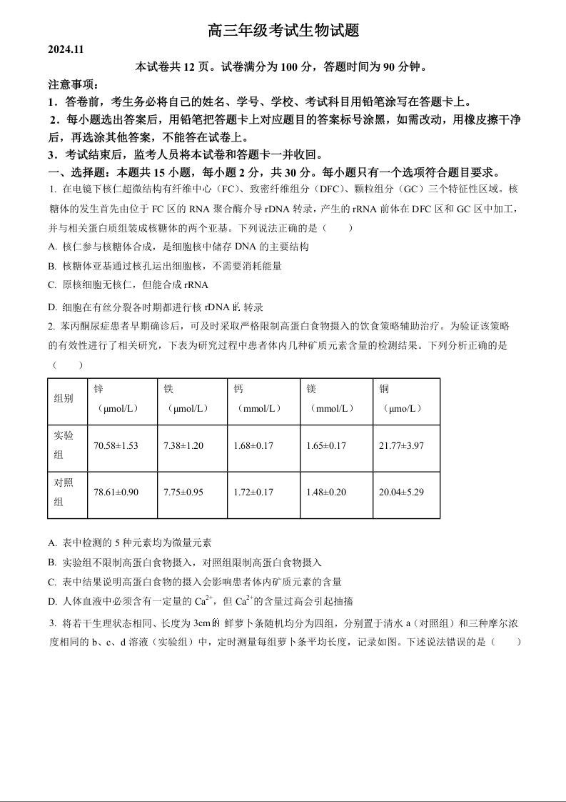 山东省泰安市2025届高三11月期中考试 生物