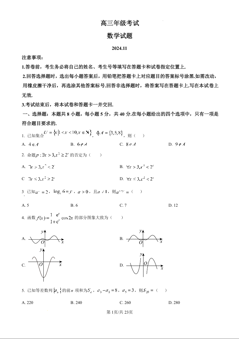 山东省泰安市2025届高三11月期中考试 数学