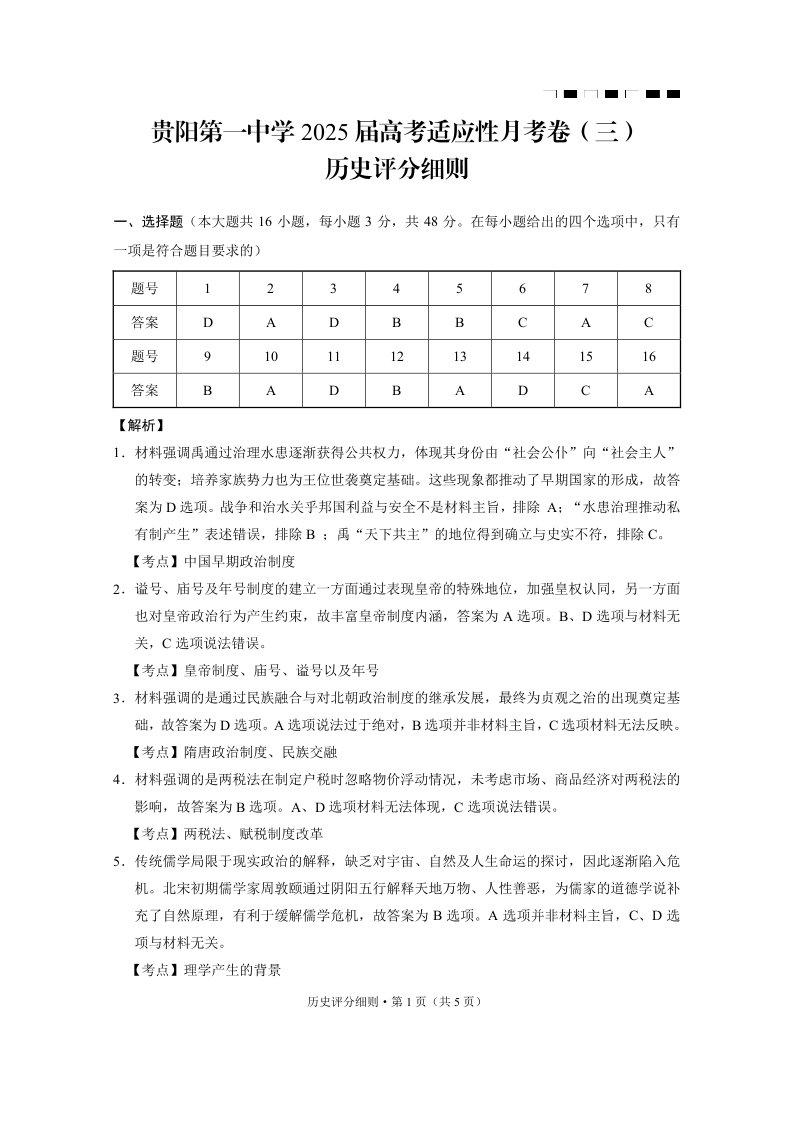 贵阳第一中学2025届高考适应性月考卷(三)历史答案