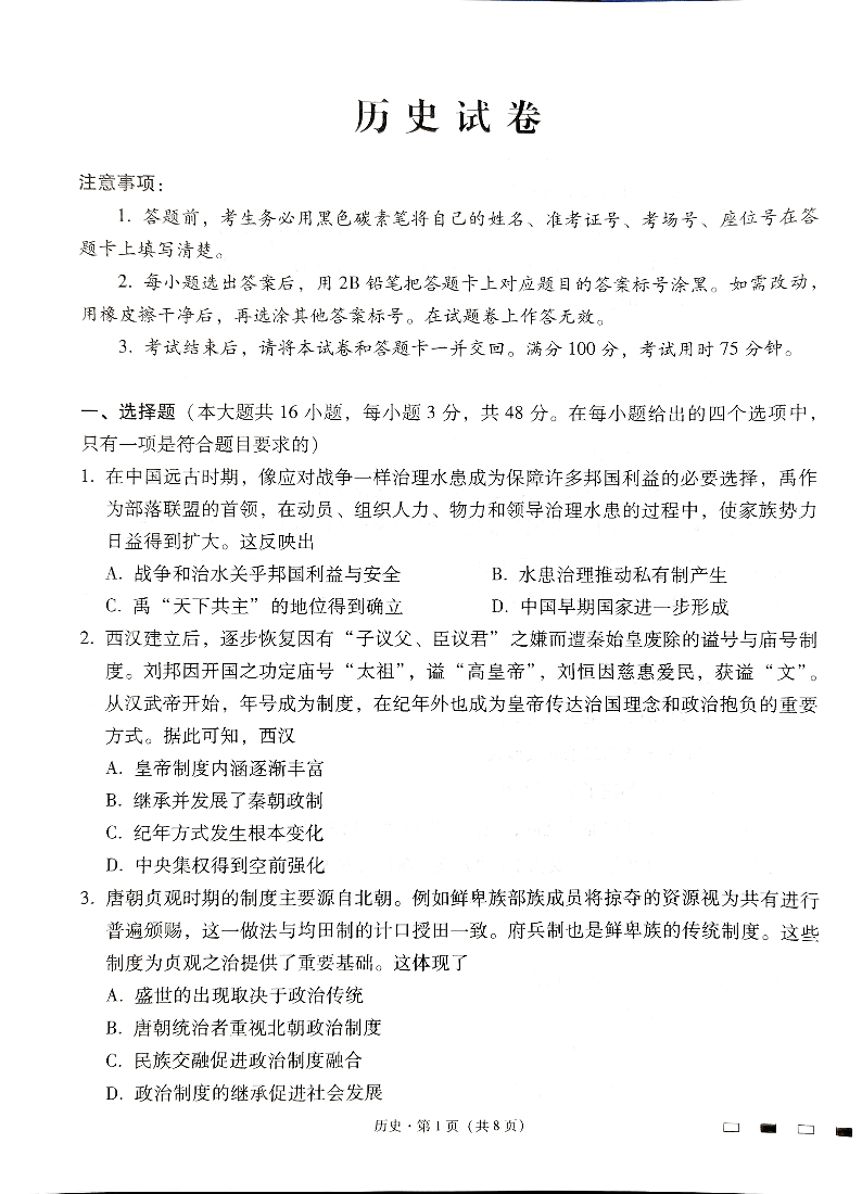 贵阳第一中学2025届高考适应性月考卷(三)历史