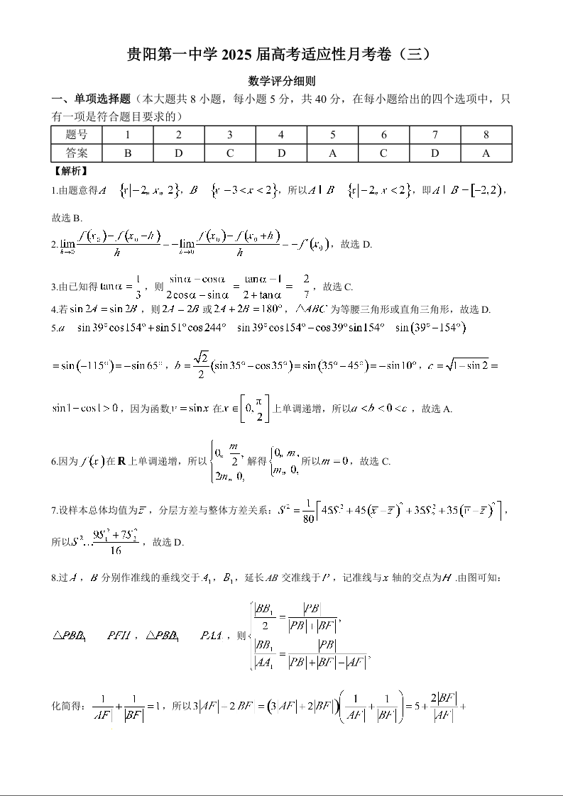 贵阳第一中学2025届高考适应性月考卷(三)数学答案