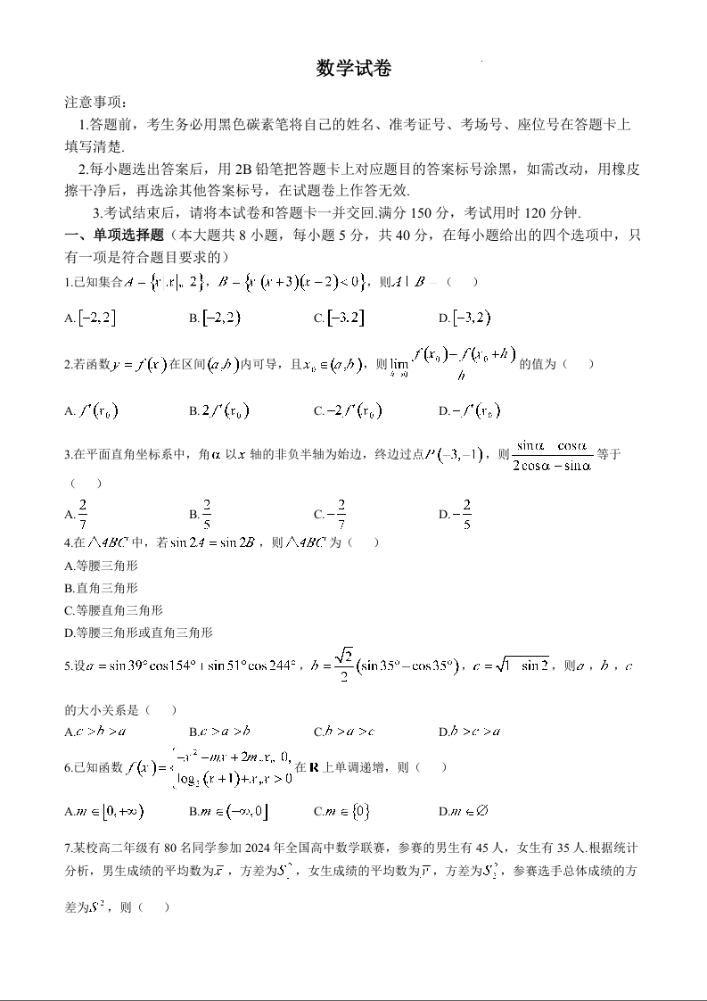 贵阳第一中学2025届高考适应性月考卷(三)数学