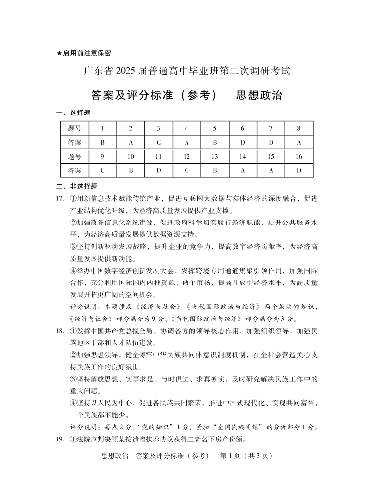 广东省2025届普通高中毕业班第二次调研考试 政治答案