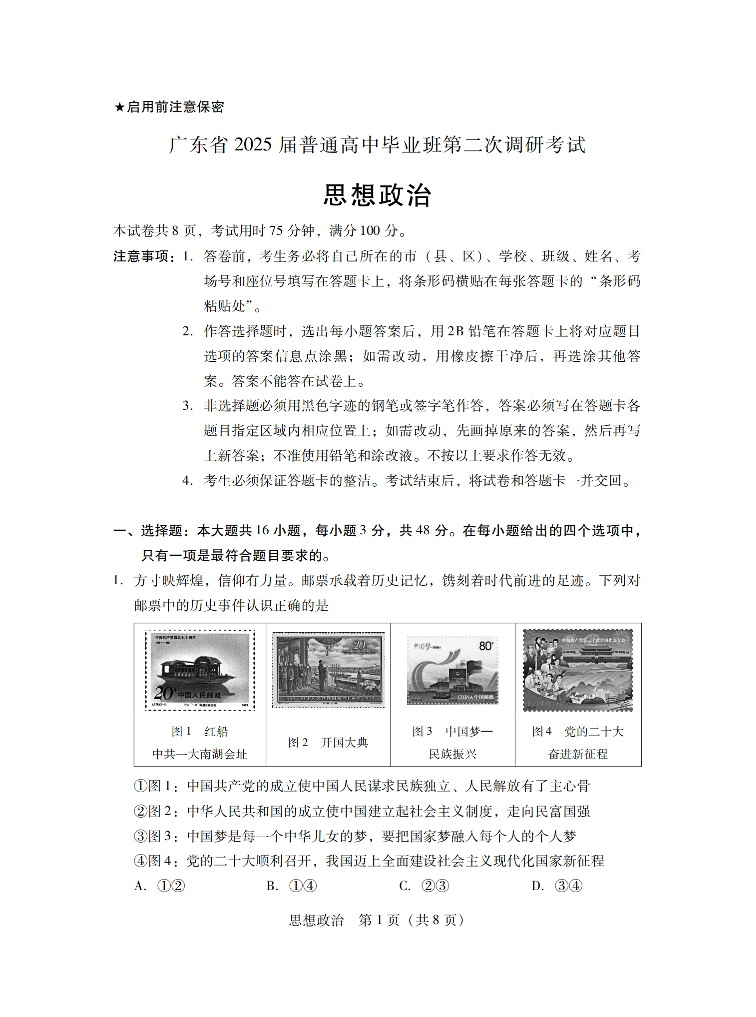广东省2025届普通高中毕业班第二次调研考试 政治