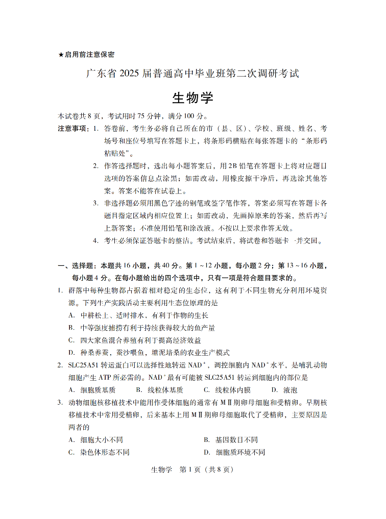 广东省2025届普通高中毕业班第二次调研考试 生物