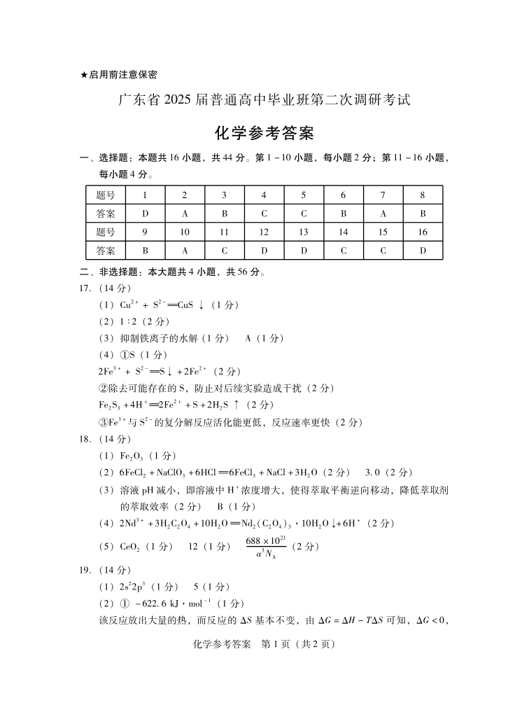 广东省2025届普通高中毕业班第二次调研考试 化学答案