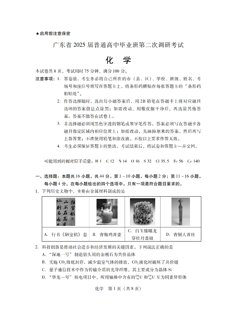 广东省2025届普通高中毕业班第二次调研考试 化学