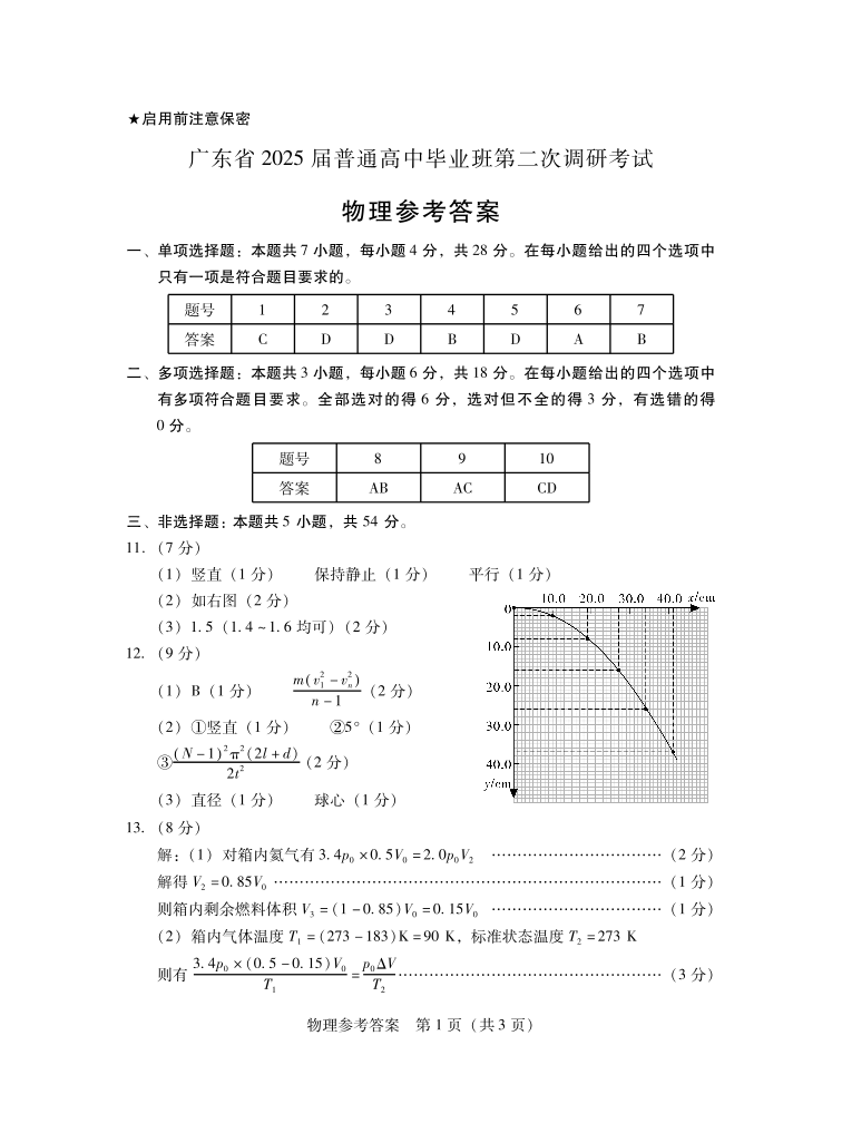 广东省2025届普通高中毕业班第二次调研考试 物理答案