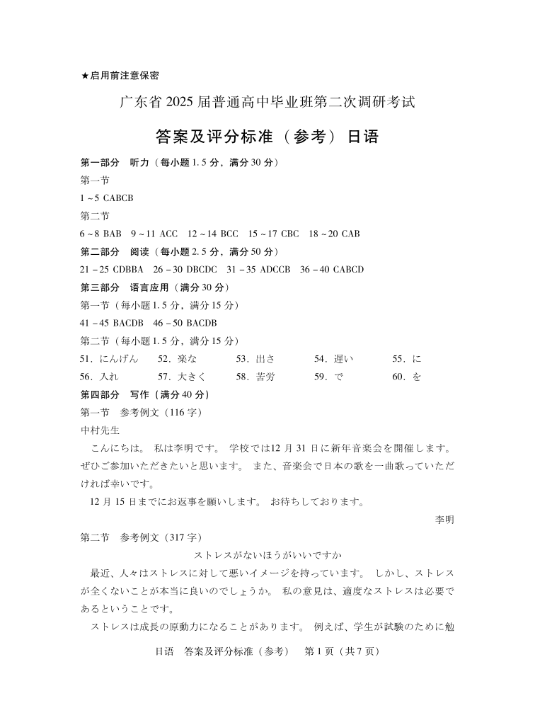 广东省2025届普通高中毕业班第二次调研考试 日语答案