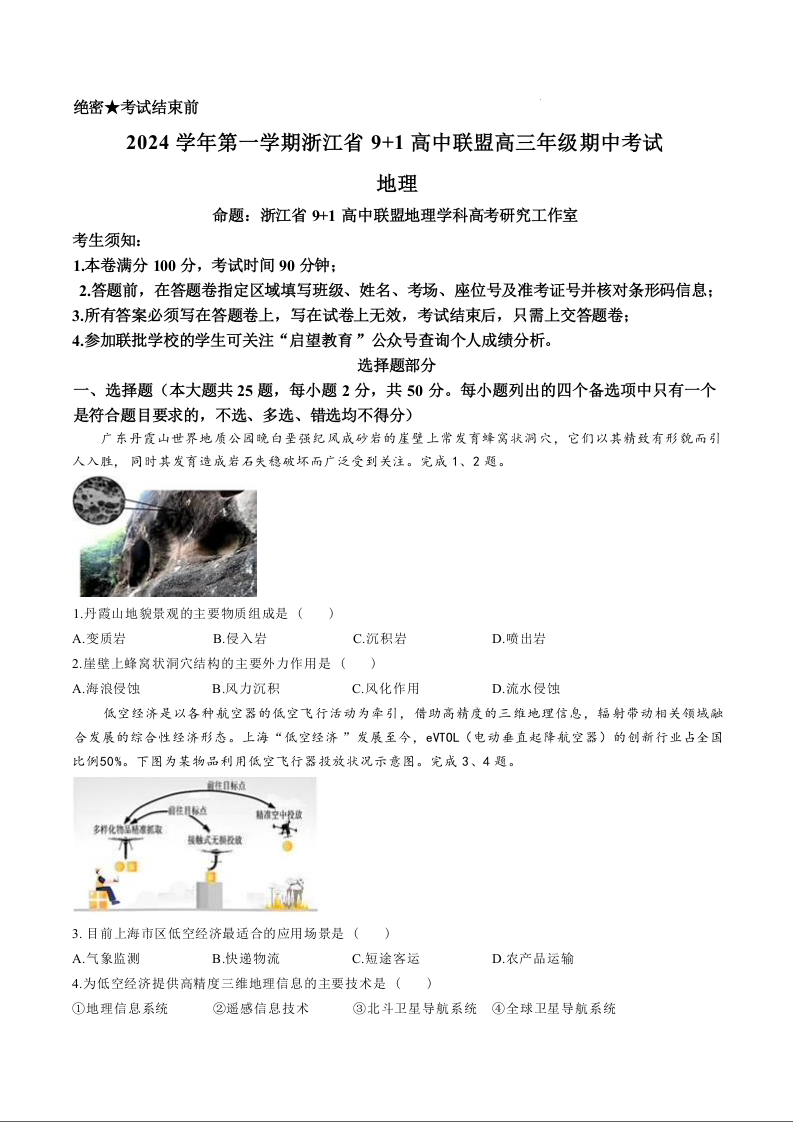 浙江省2024学年第一学期浙江省9+1高中联盟高三年级期中考试 地理