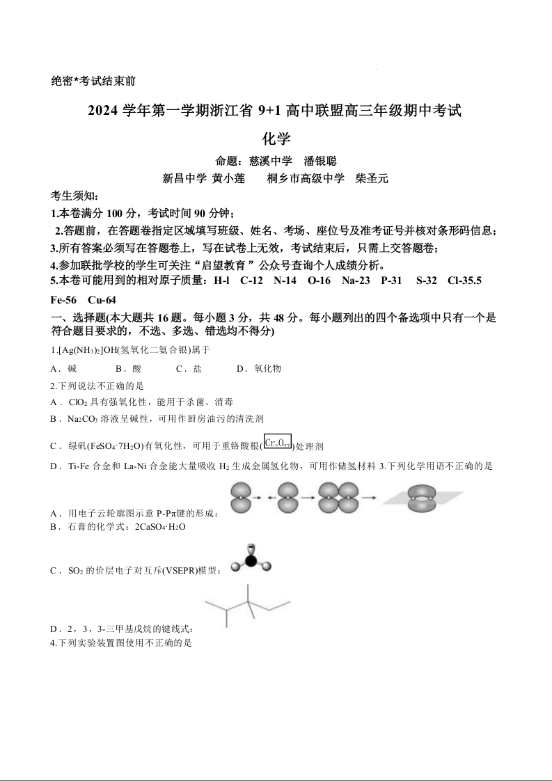 浙江省2024学年第一学期浙江省9+1高中联盟高三年级期中考试 化学