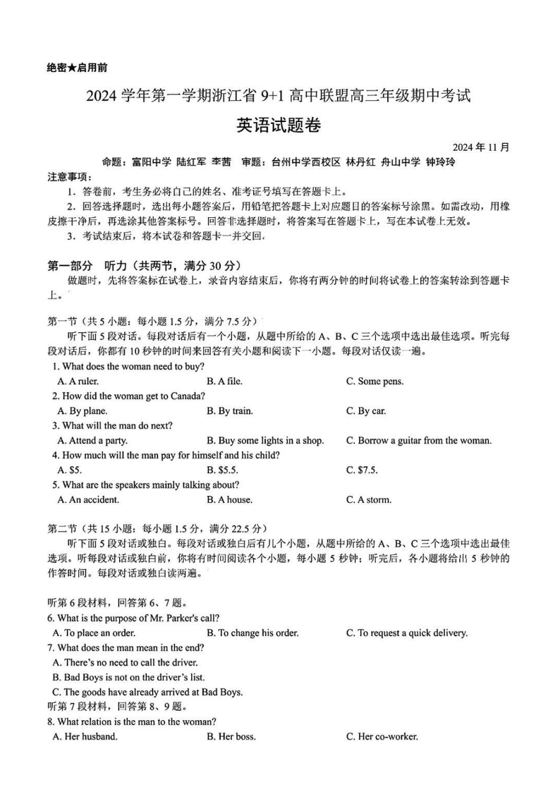 浙江省2024学年第一学期浙江省9+1高中联盟高三年级期中考试 英语