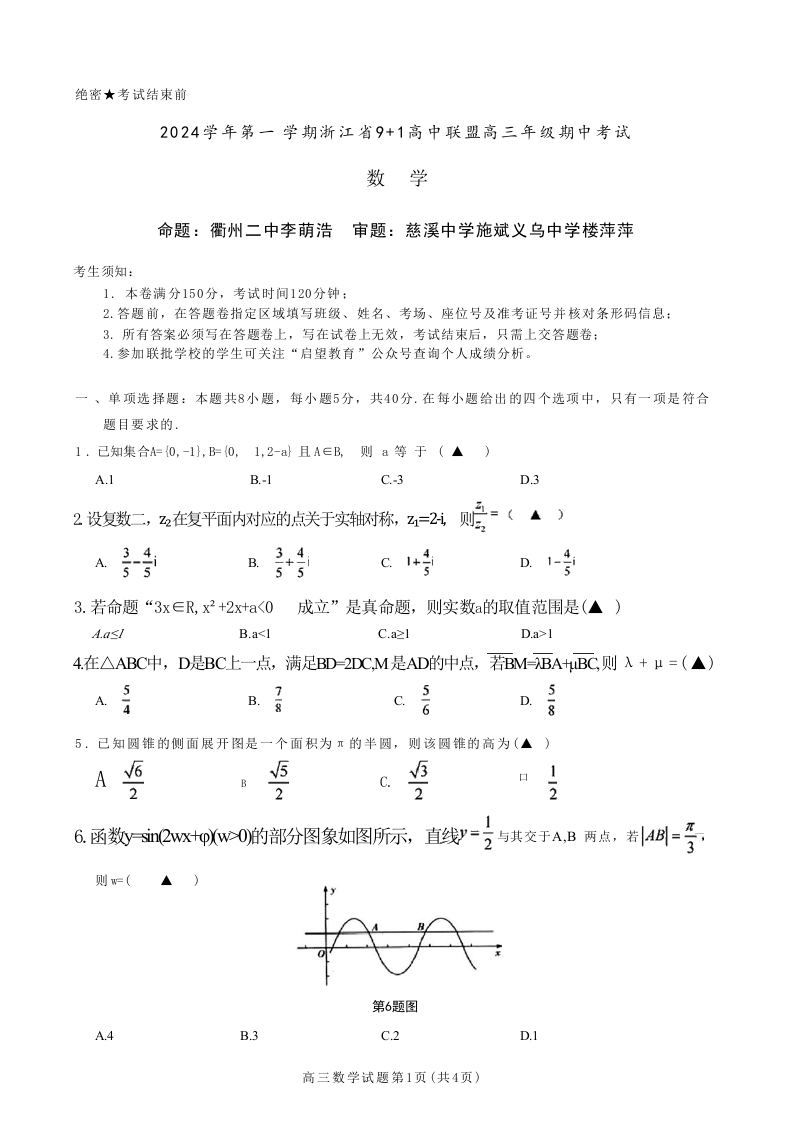 浙江省2024学年第一学期浙江省9+1高中联盟高三年级期中考试 数学