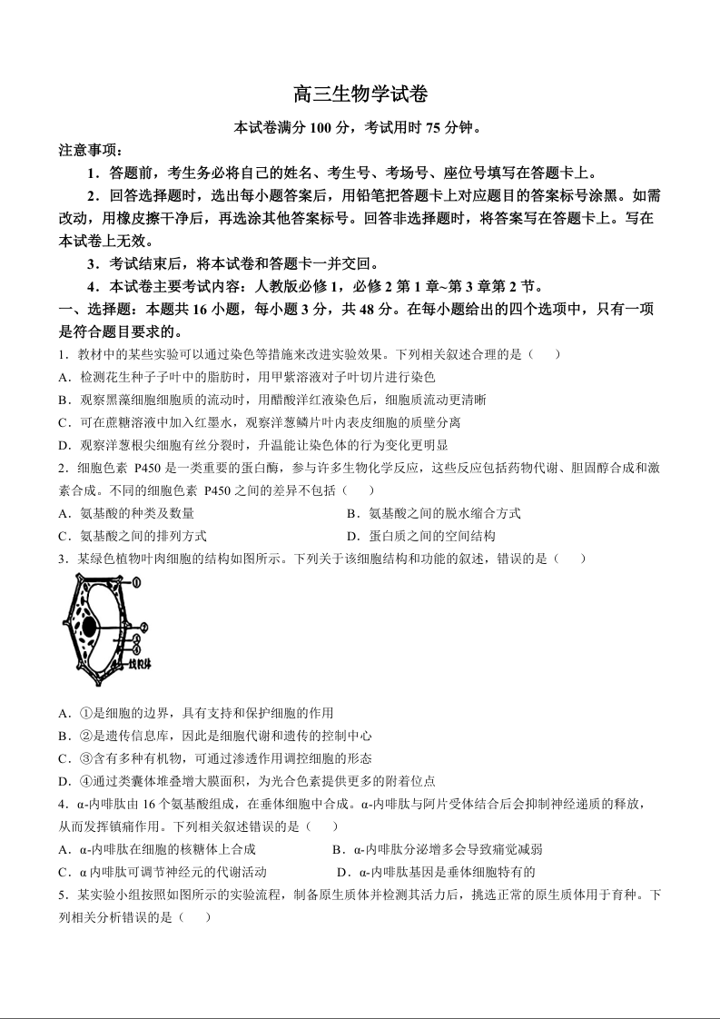青海省名校联盟2024~2025学年高三上学期期中联考 生物