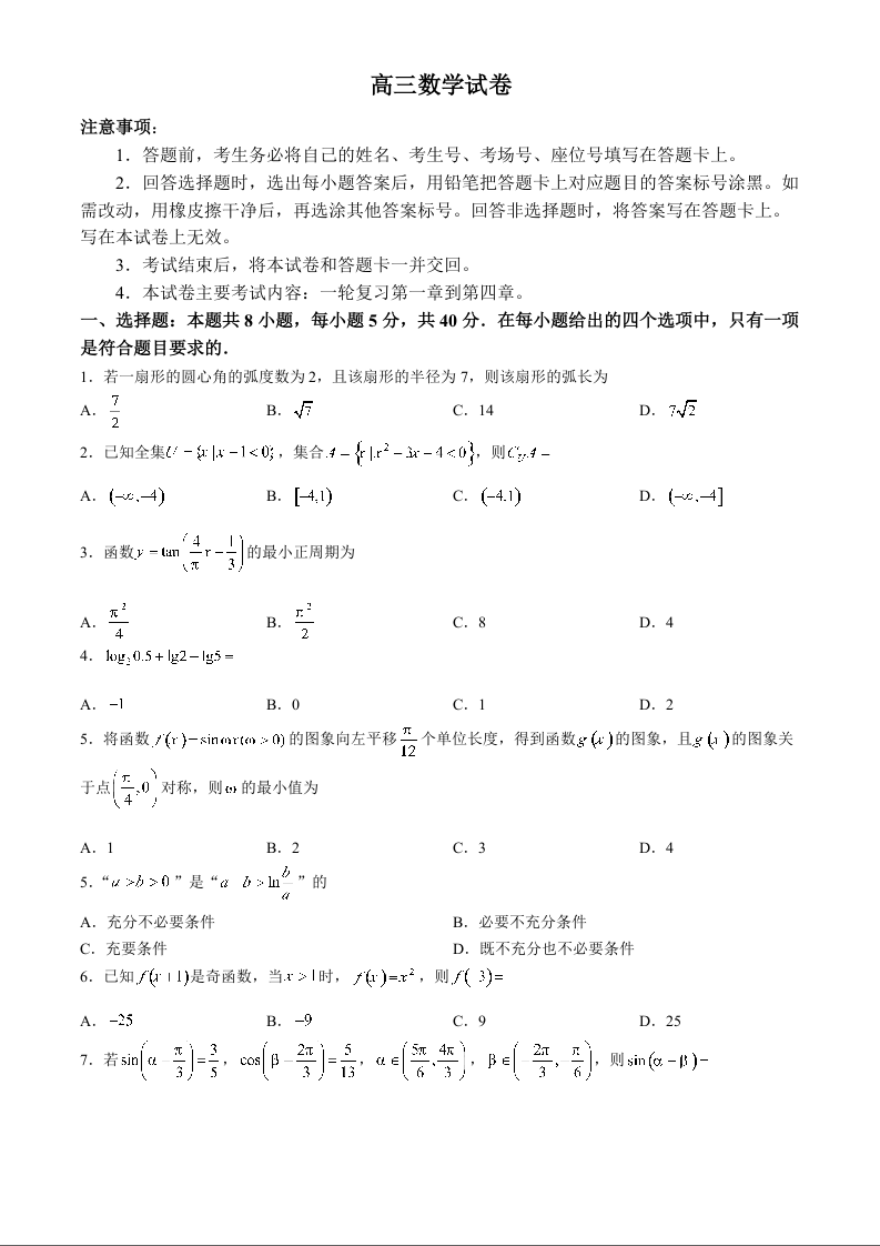 青海省名校联盟2024~2025学年高三上学期期中联考 数学