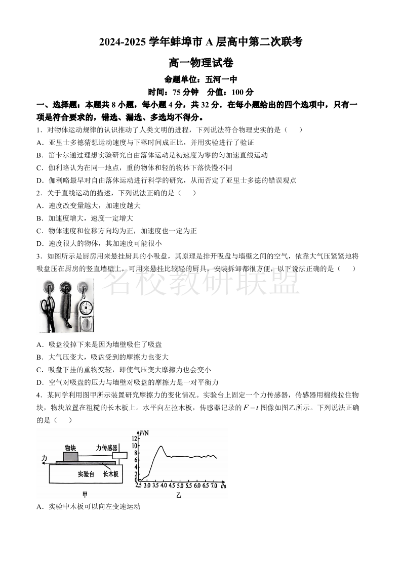 安徽省蚌埠市A层高中2024-2025学年高一上学期11月期中考试 物理