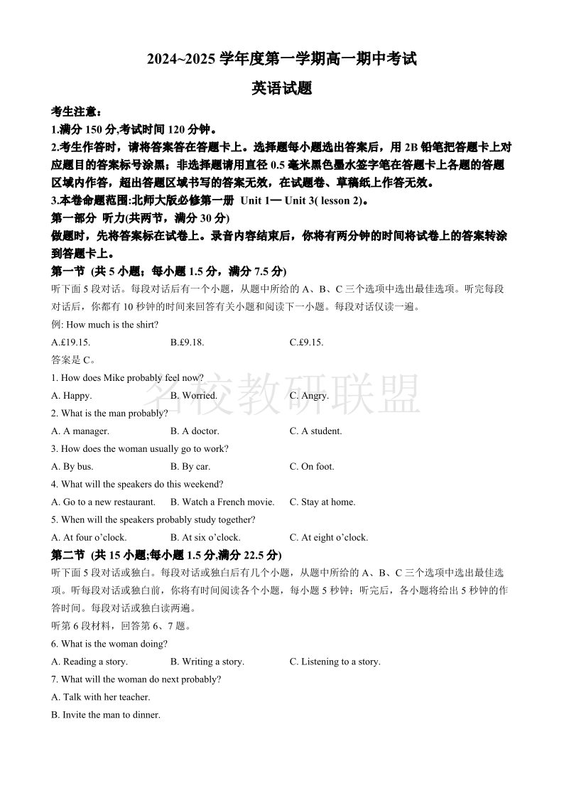 安徽省滁州市九校联考2024-2025学年高一上学期11月期中考试 英语