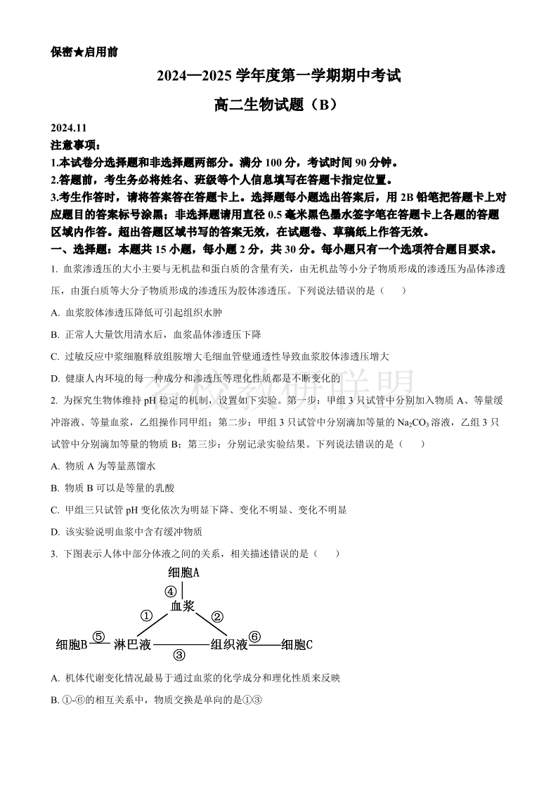 山东省菏泽市2024-2025学年高二上学期期中考试 生物