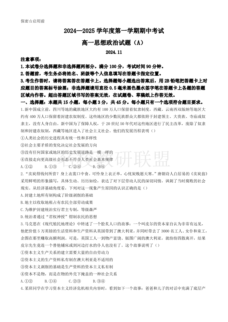 山东省菏泽市2024-2025学年高一上学期11月期中考试 政治