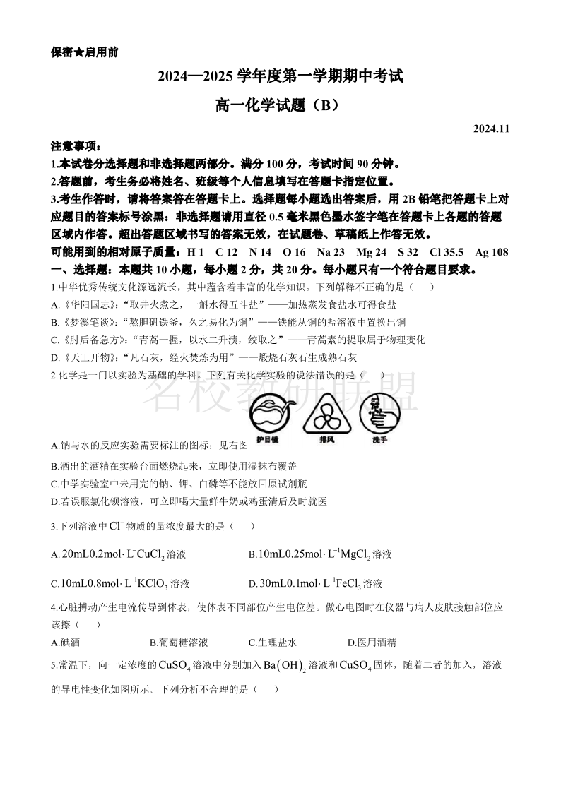 山东省菏泽市2024-2025学年高一上学期11月期中考试 化学