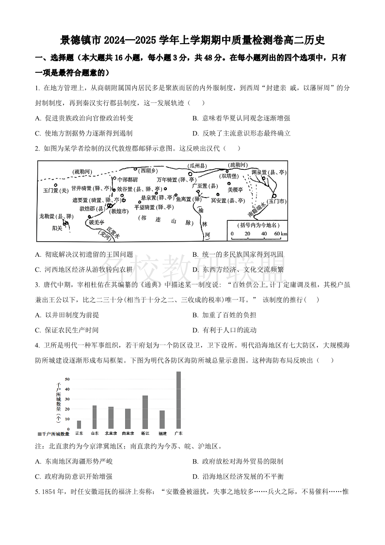 江西省景德镇市2024-2025学年高二上学期期中检测 历史