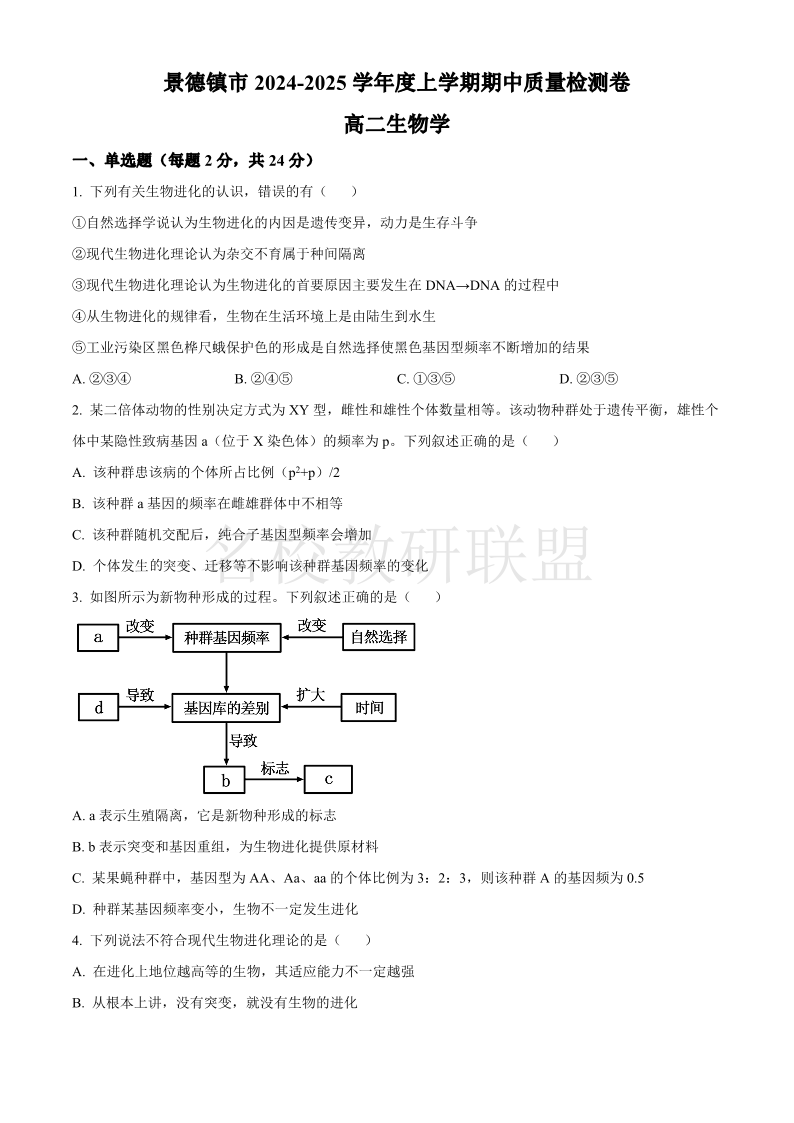 江西省景德镇市2024-2025学年高二上学期期中检测 生物