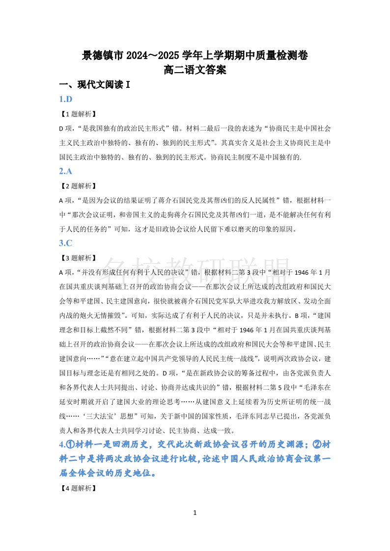 江西省景德镇市2024-2025学年高二上学期期中检测 语文答案