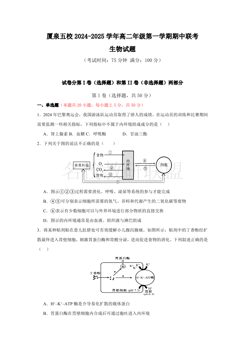 福建省厦门、泉州市五校2024-2025学年高二上学期11月期中联考 生物
