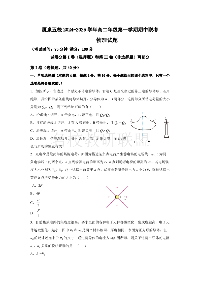 福建省厦门、泉州市五校2024-2025学年高二上学期11月期中联考 物理