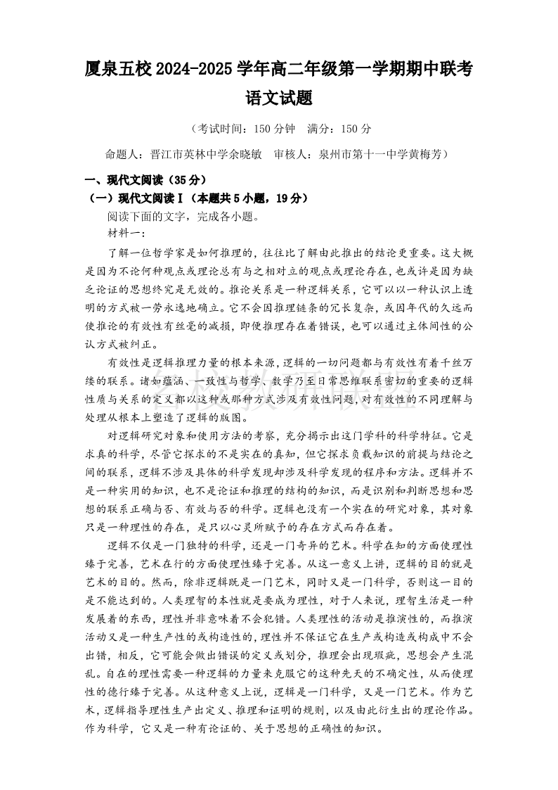福建省厦门、泉州市五校2024-2025学年高二上学期11月期中联考 语文